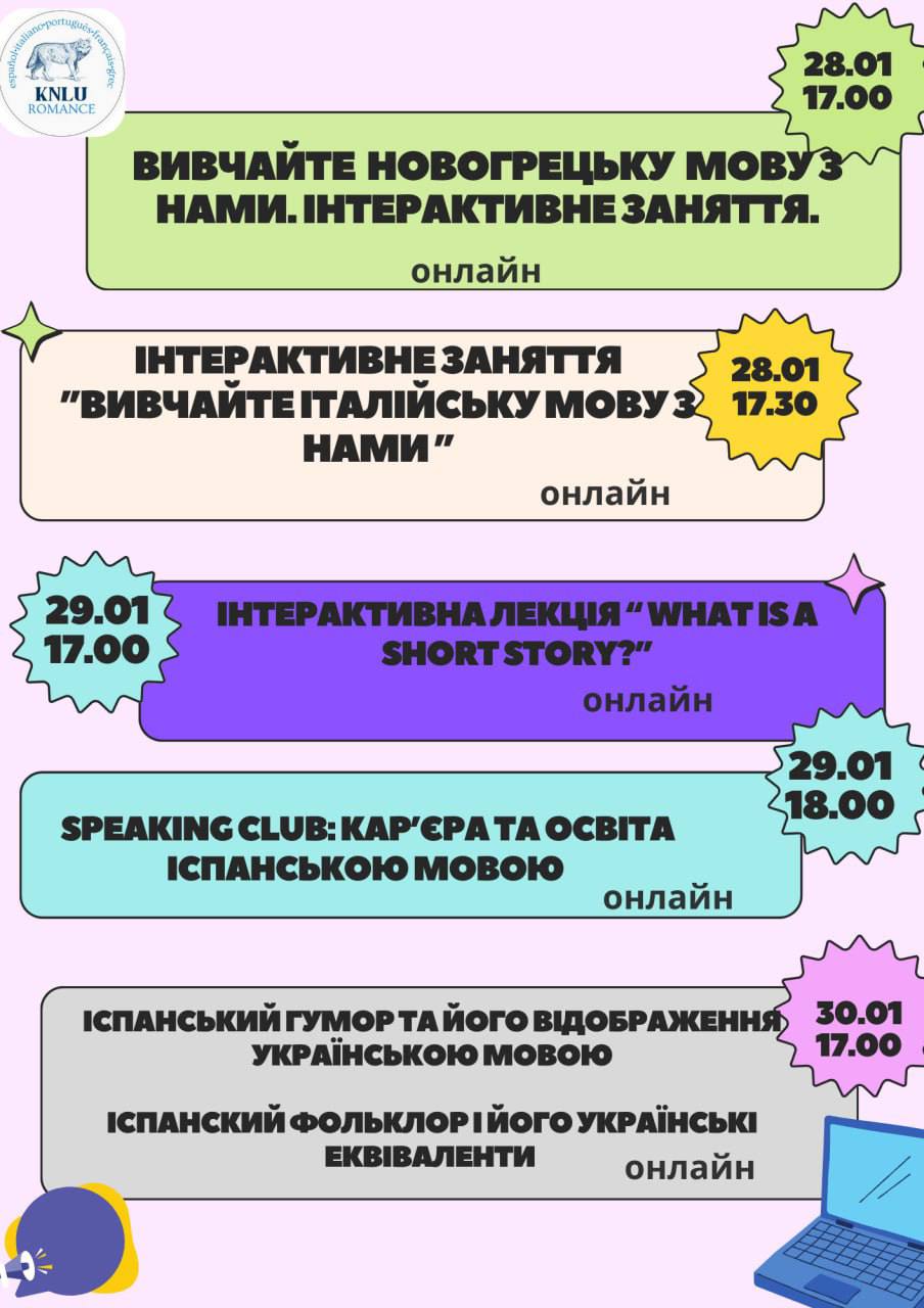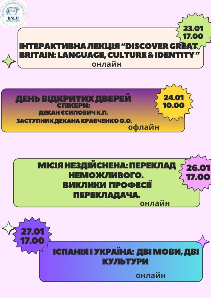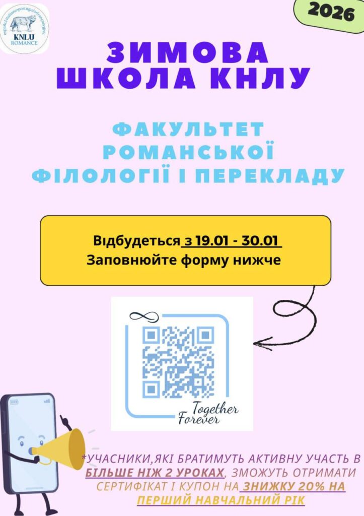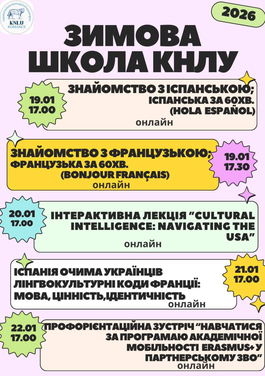 Раді запросити вас на Зимову школу факультету романської філології і перекладу, яка відбудеться 📆 з 19 по 30 січня.
