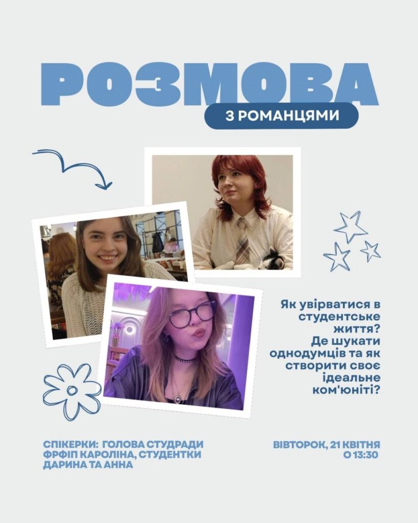 Кажуть, найкращі студентські історії починаються з одного вдалого знайомства ☕️ Давай почнемо твою історію вже зараз! Студрада факультету збирає своїх майбутніх студентів на «Розмову з романцями».
